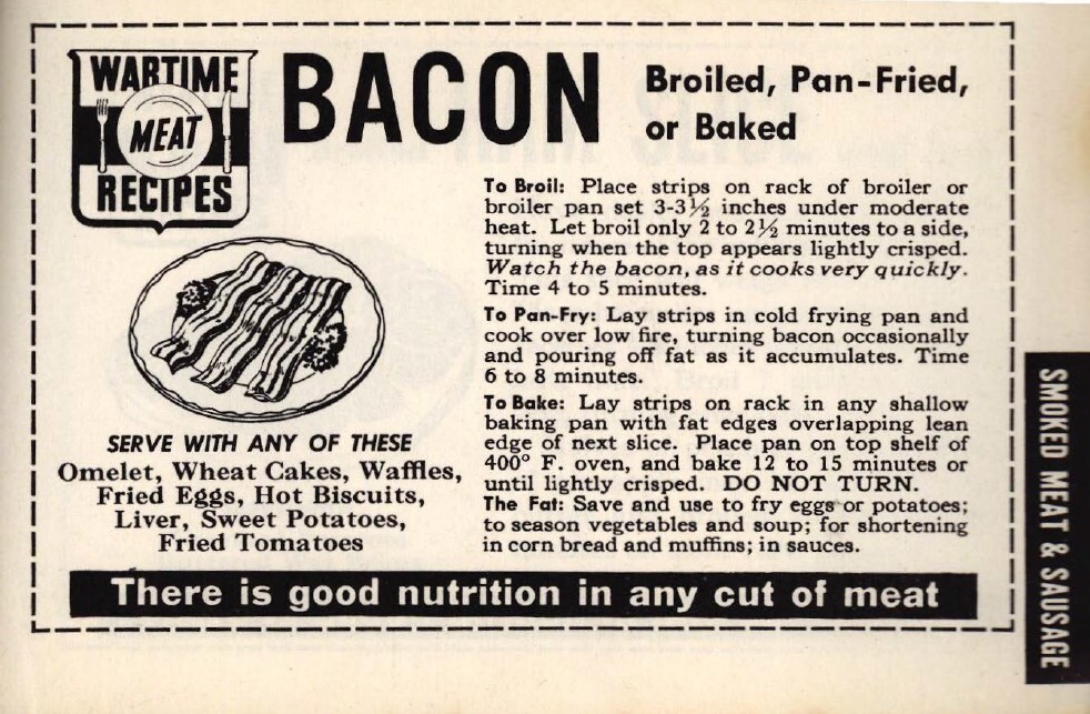 The recipes highlight a time during World War II when many staple foods became scarce, as they were used to feed troops, and rationing was a requirement. 120 Wartime Meat Recipies encourages families to use a variety of cuts (page 4), including organ meat like the heart, kidney, tongue, or sweetbreads (the thymus and pancreas glands).