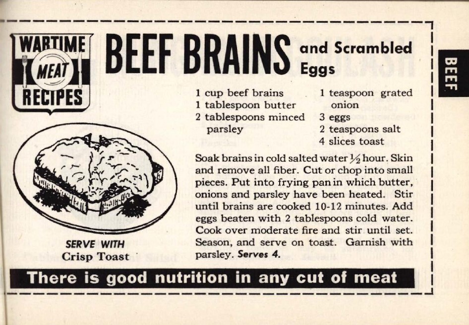 Brains were a Midwest working-class food that rose in popularity in the late 19th century. 120 Wartime Meat Recipes includes several brain recipes using both beef and pig brains (page 32).